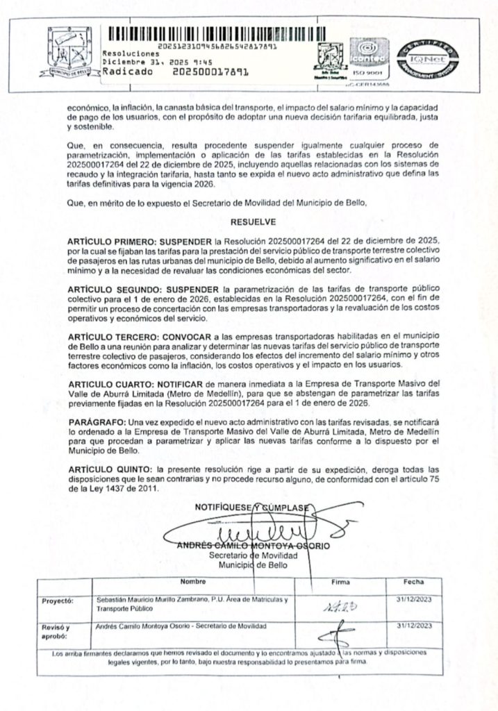 La Secretaría de Movilidad de Bello anunció la suspensión de la resolución que fijaba las tarifas del transporte público colectivo para 2026, decisión que obedece al reciente incremento del salario mínimo decretado por el Gobierno Nacional para el próximo año. El aumento salarial, que impacta directamente los costos operativos del sector, llevó a la administración municipal a frenar el ajuste mientras se realiza una revisión más profunda del modelo tarifario.