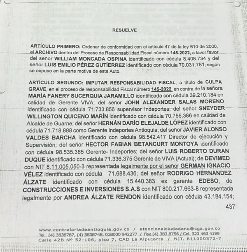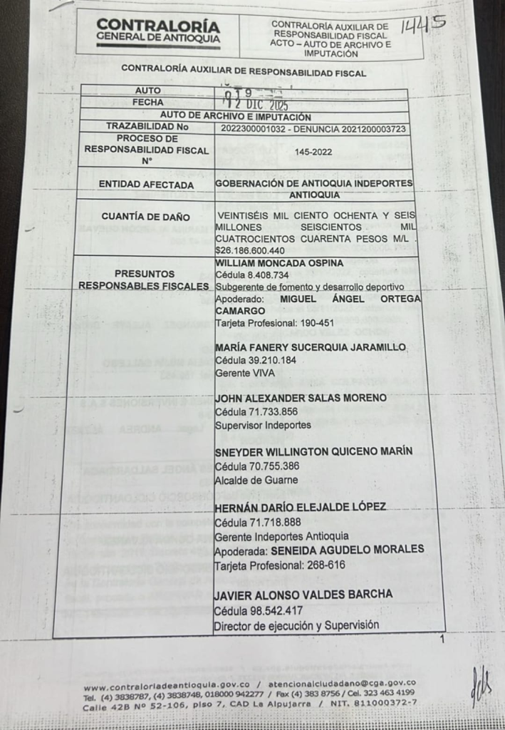 La Contraloría General de Antioquia a través de la oficina auxiliar de Responsabilidad Fiscal, emitió auto de archivo e imputación por más de 26 mil millones de pesos, por caso ciclorutas de Oriente, a presuntos responsables fiscales, entre ellos Gobernador de Antioquia, Andrés Julián Rendón, alcalde de Rionegro para la época de los hechos; y el actual gerente de Viva, Rodrigo Hernández, ex gerente de EDESO para la época de los hechos, así como a otros funcionarios y contratistas.