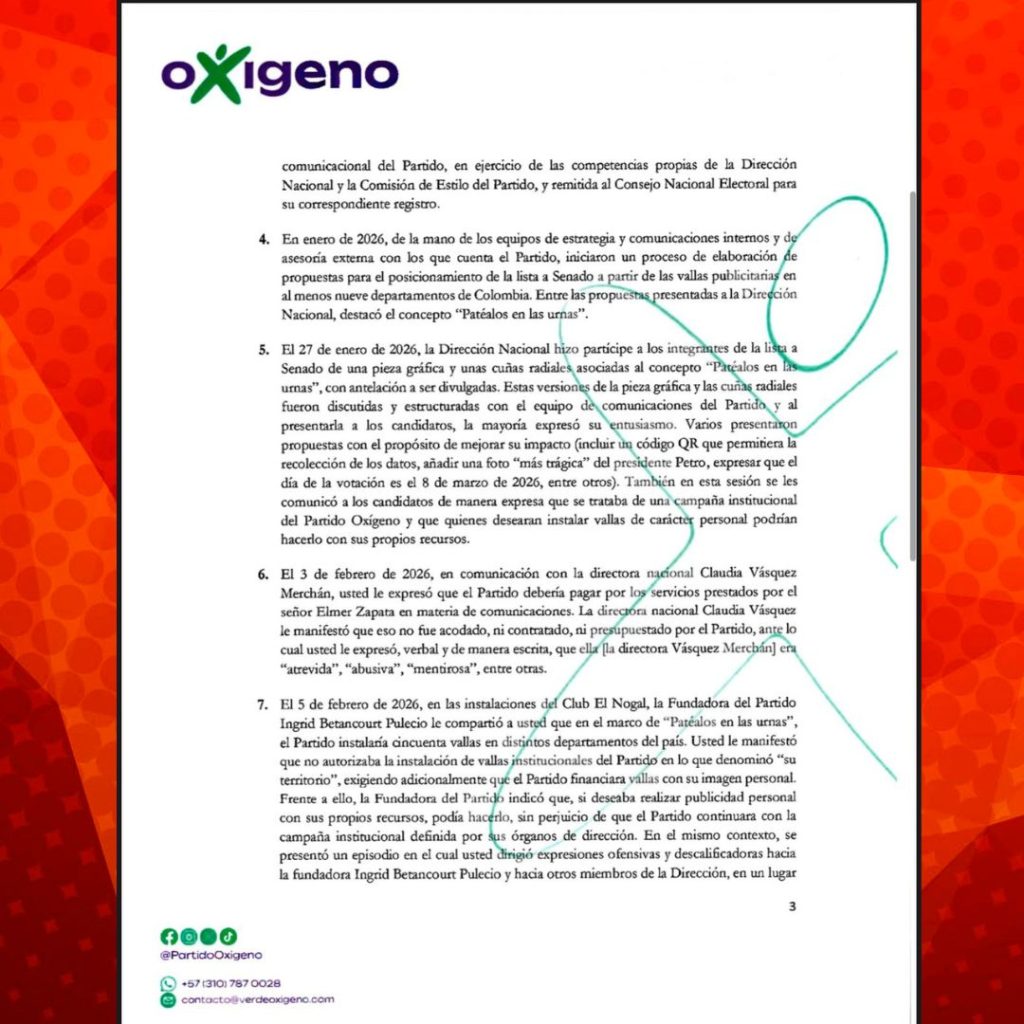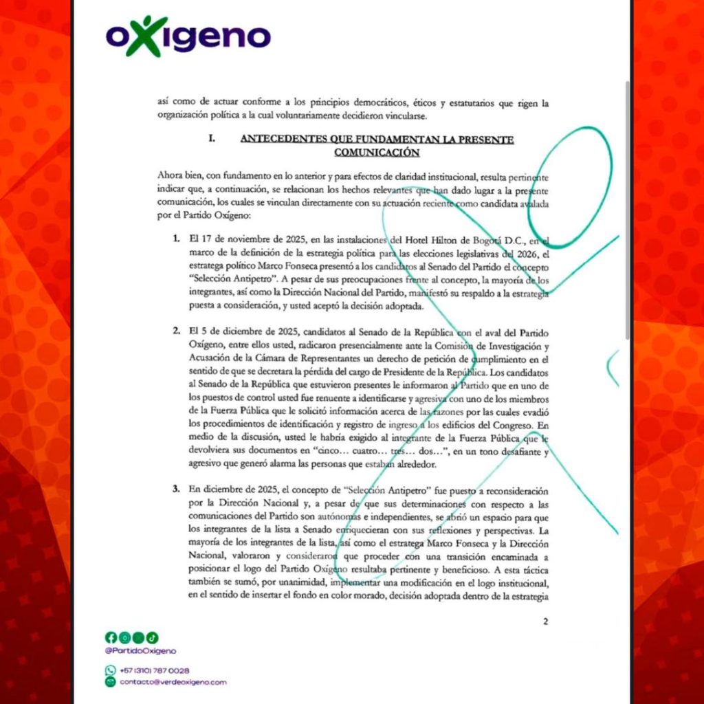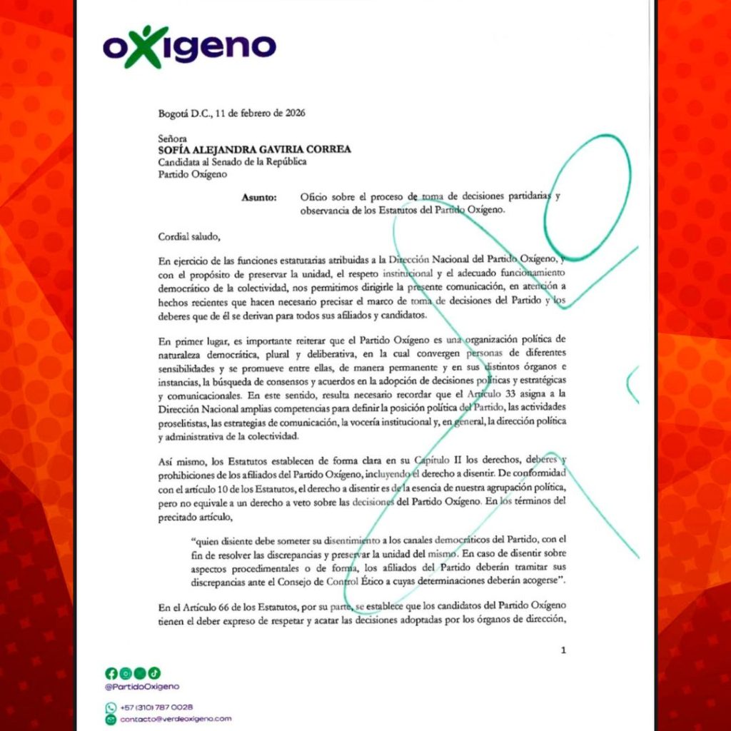 La Dirección Nacional del Partido Oxígeno, liderada por Ingrid Betancourt, envió una comunicación formal a Sofía Gaviria, candidata al Senado por esa colectividad, en la que le llama la atención por diferencias internas, episodios de confrontación y desacuerdos sobre la estrategia política y comunicacional del partido.