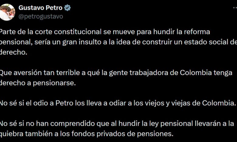 El presidente Gustavo Petro expresó en X su preocupación por el proceso que adelanta la Corte Constitucional sobre la reforma pensional aprobada por el Congreso. Según el mandatario, algunos sectores dentro del tribunal estarían inclinándose hacia decisiones que podrían dejar sin efecto la ley, lo que él considera un riesgo para el modelo de Estado social de derecho.