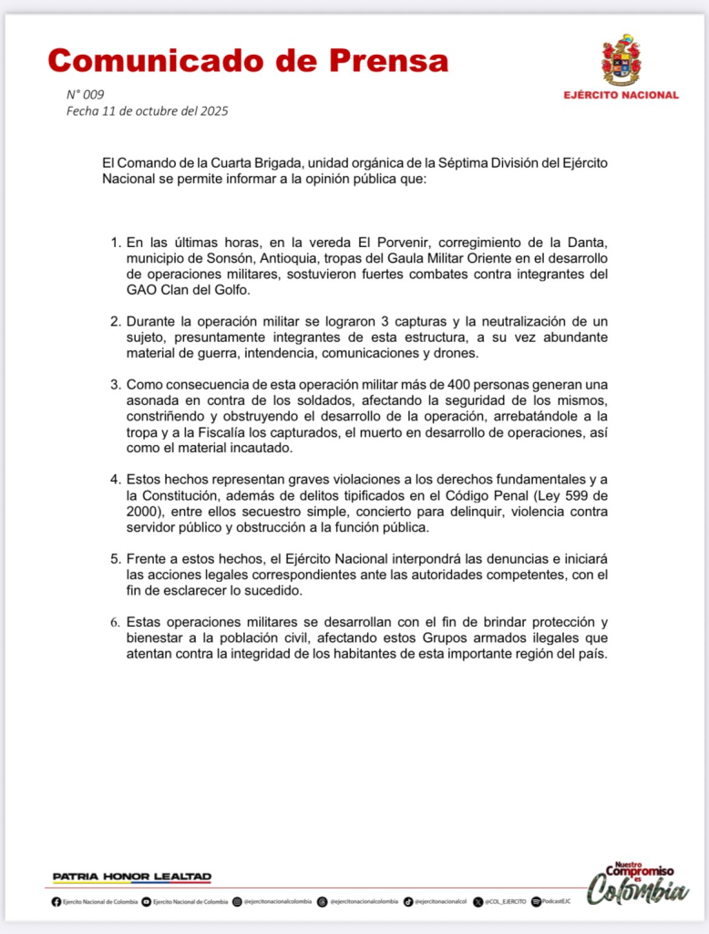 Lo que comenzó como un operativo militar contra el Clan del Golfo en el sector La Danta, del municipio de Sonsón (Oriente Antioqueño), terminó en una violenta asonada por parte de la comunidad. El enfrentamiento inicial entre las tropas y presuntos criminales dejó como saldo un miembro del grupo armado ilegal muerto y tres capturados. Sin embargo, la posterior reacción de cerca de 400 personas resultó en la incineración de vehículos del Ejército y la liberación de los detenidos.