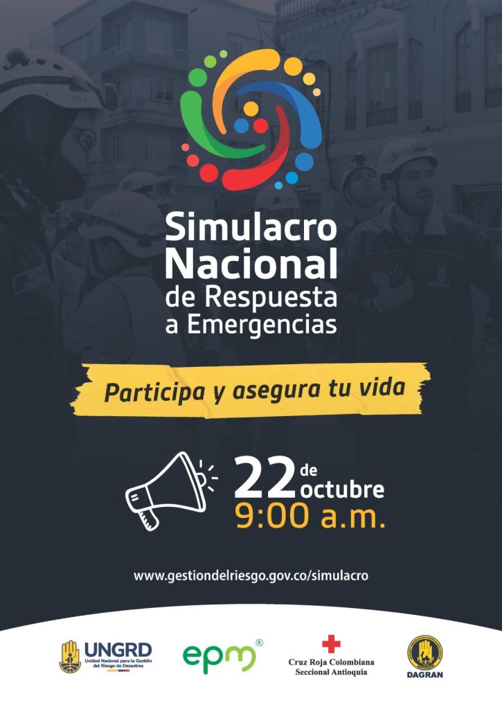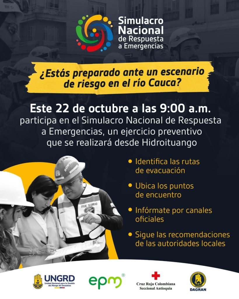 La Unidad Nacional para la Gestión del Riesgo de Desastres -UNGRD- anunció que el próximo 22 de octubre a las 9:00 a. m. se realizará el Simulacro Nacional de Respuesta a Emergencias, que este año tendrá como centro de operaciones la Central Hidroeléctrica Ituango.